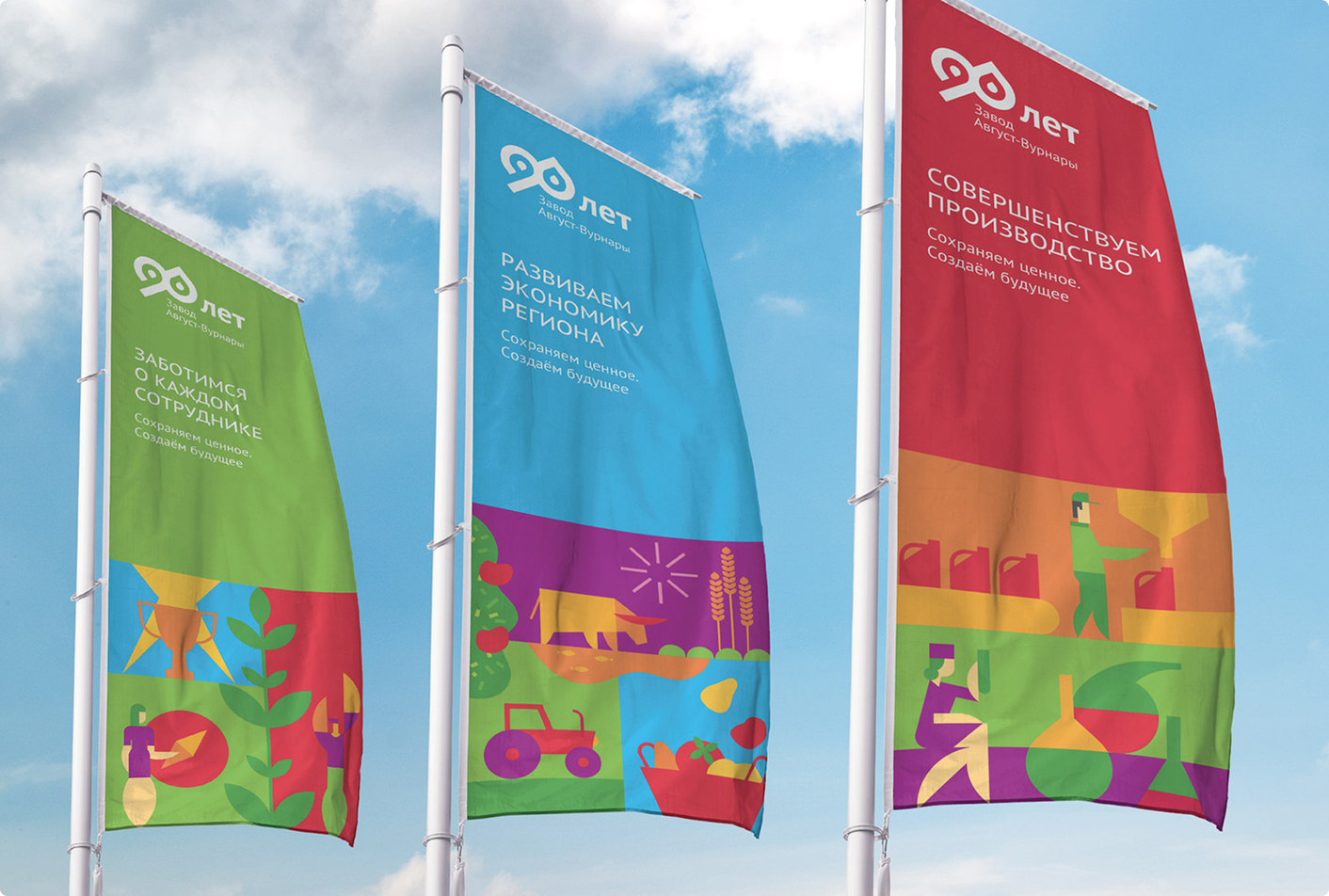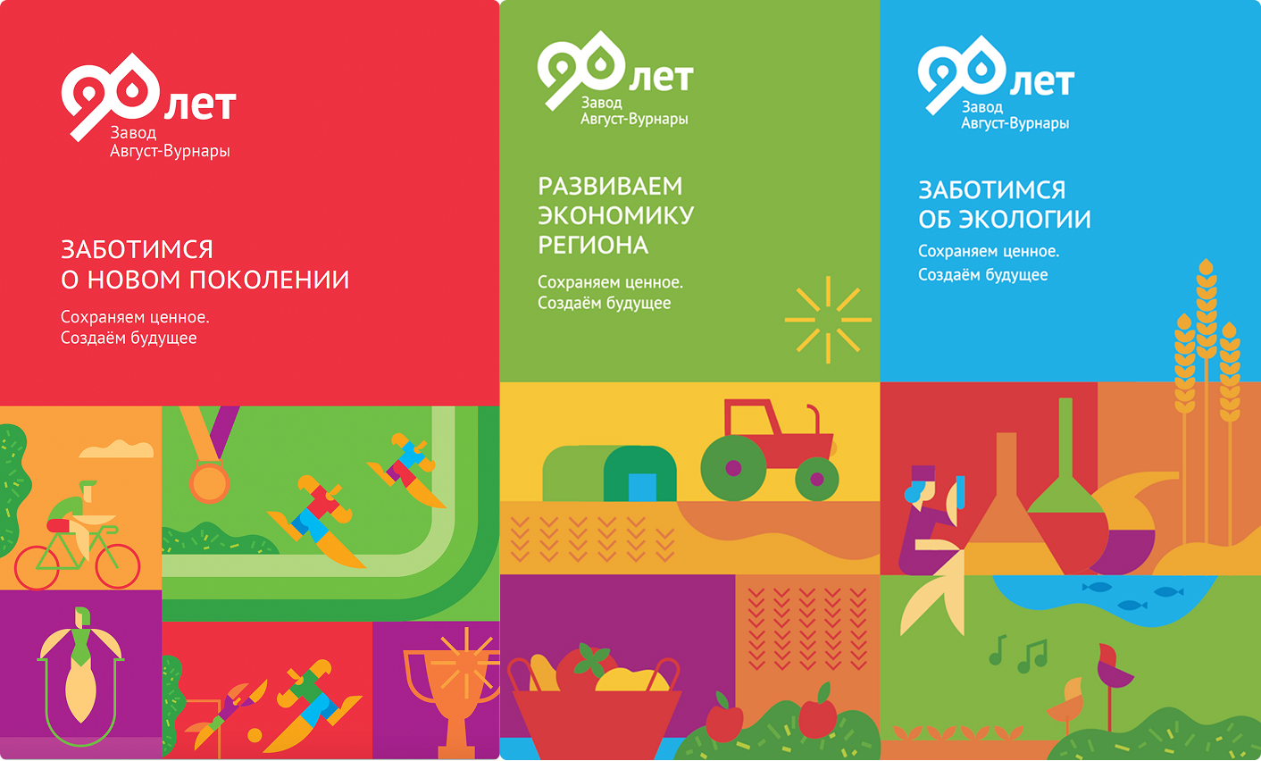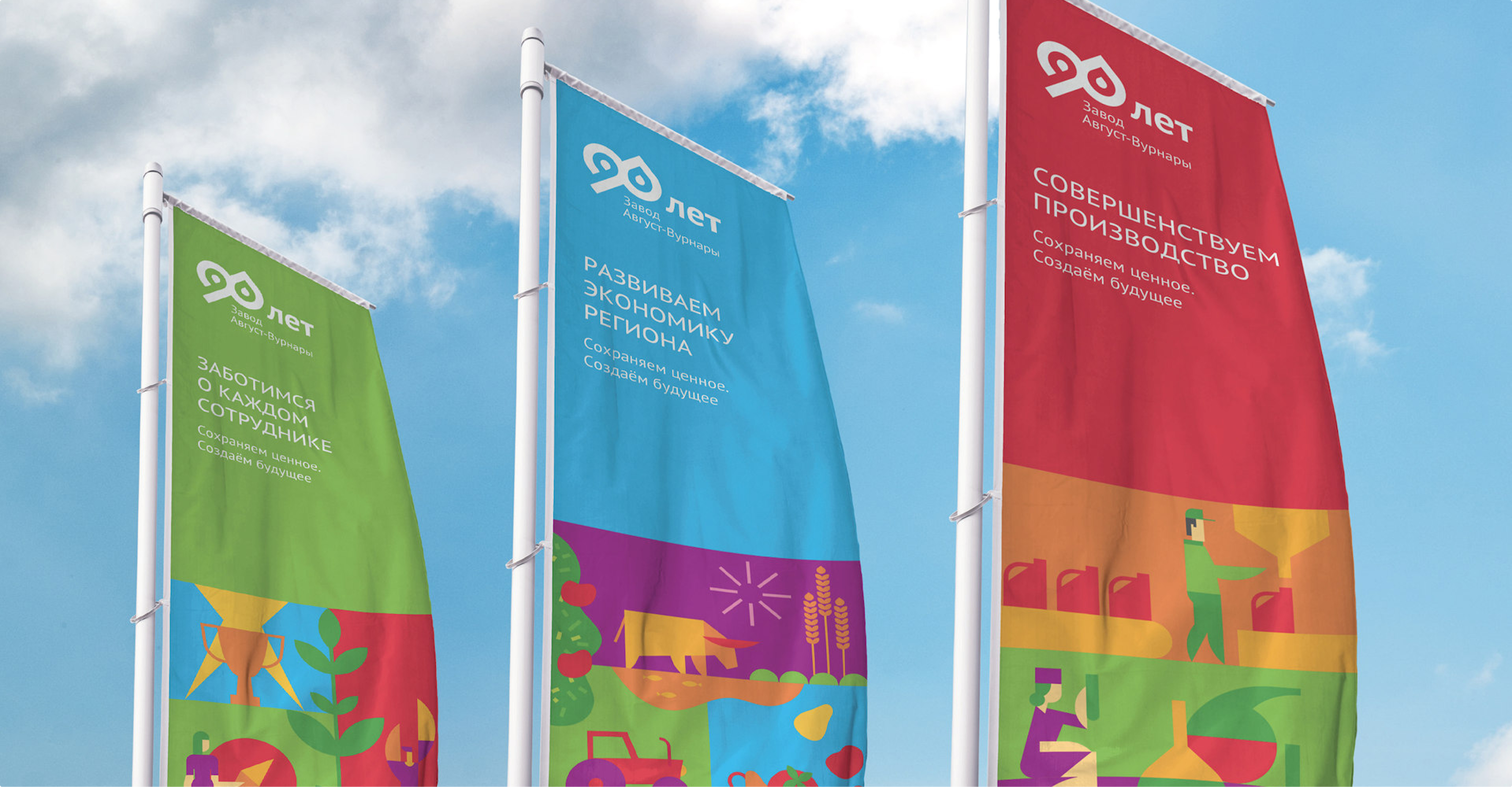 В рамках проекта мы сделали фирменный стиль, генеральный слоган кампании, серию хедлайнов для отражения ценностей бренда, креативную визуальную концепцию, дизайн рекламоносителей, в том числе дизайн праздничных пространственных объектов в поселке Вурнары и на территории, прилегающей к заводу.