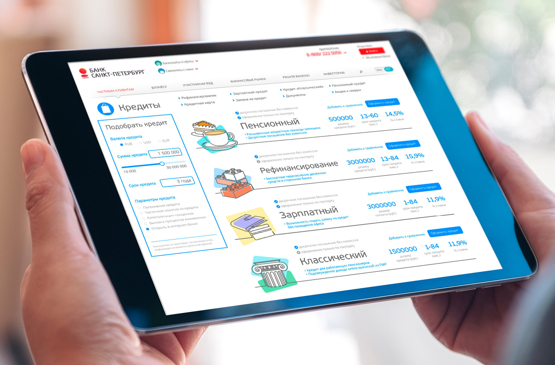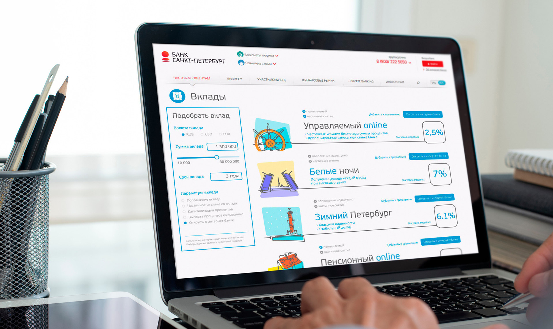 Необходимо было обновить визуальный образ линейки вкладов и кредитов на сайте банка.Мы разработали дизайн-концепцию и сделали иллюстрации для всех существующих видов вкладов и кредитов для физических лиц. Иллюстрации-метафоры, созданные движением одной линии, позволили создать визуальные акценты в сухой информации и добавить эмоциональности предложению финансового продукта. В рамках проекта мы разработали визуализацию «сезонных» продуктов, характеризующихся смысловой связью с Санкт-Петербургом и с брендом банка.