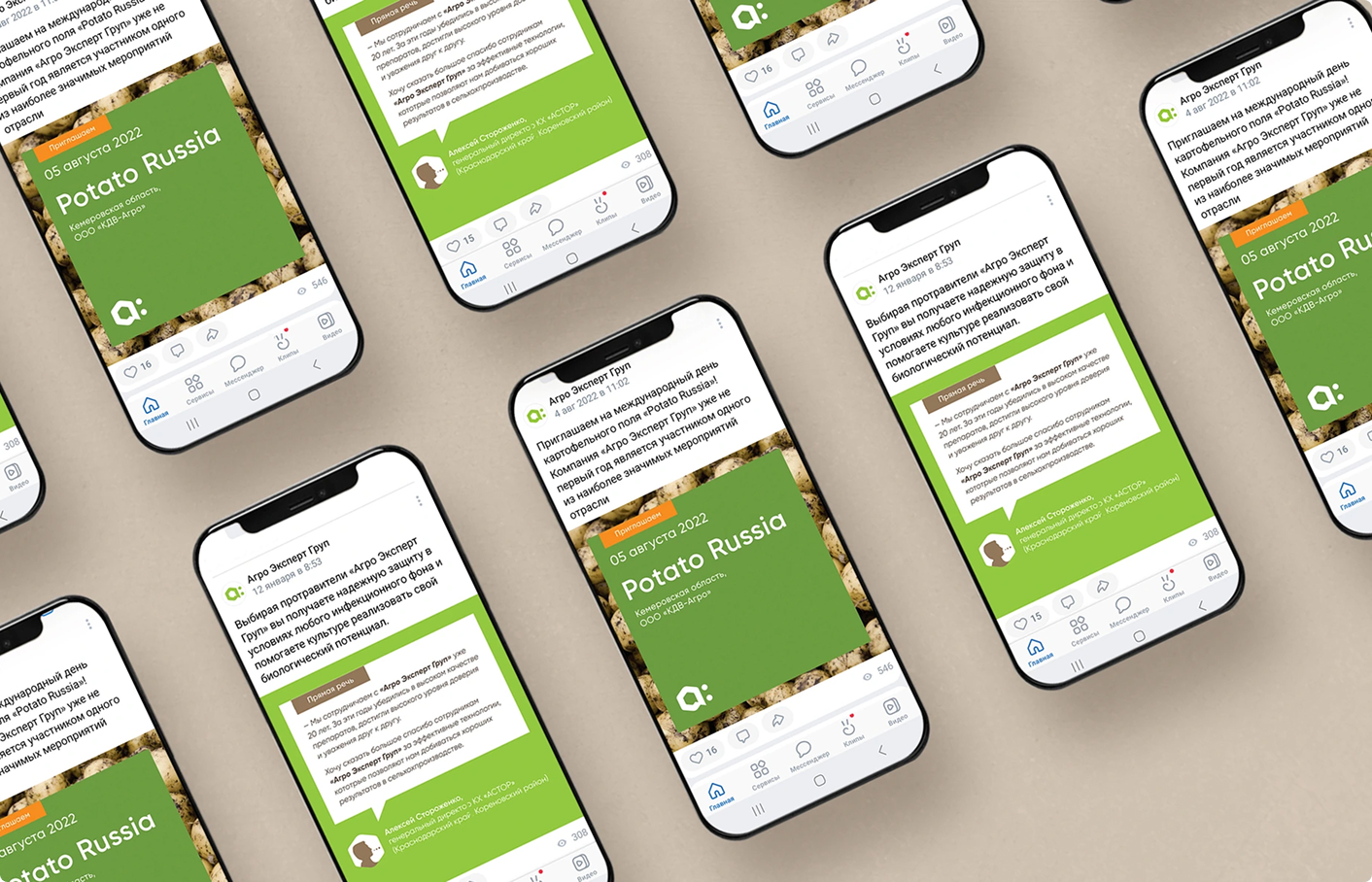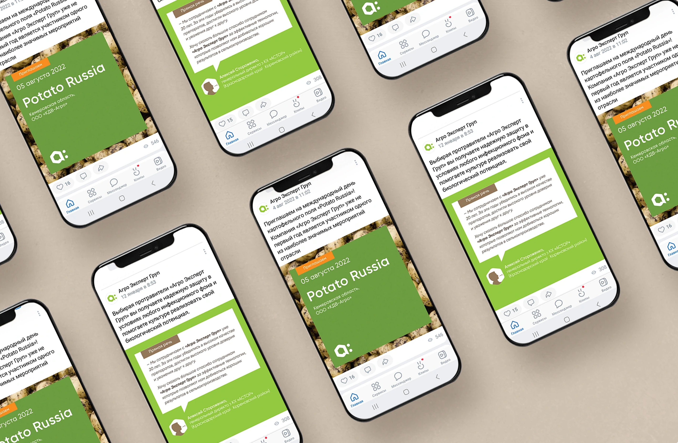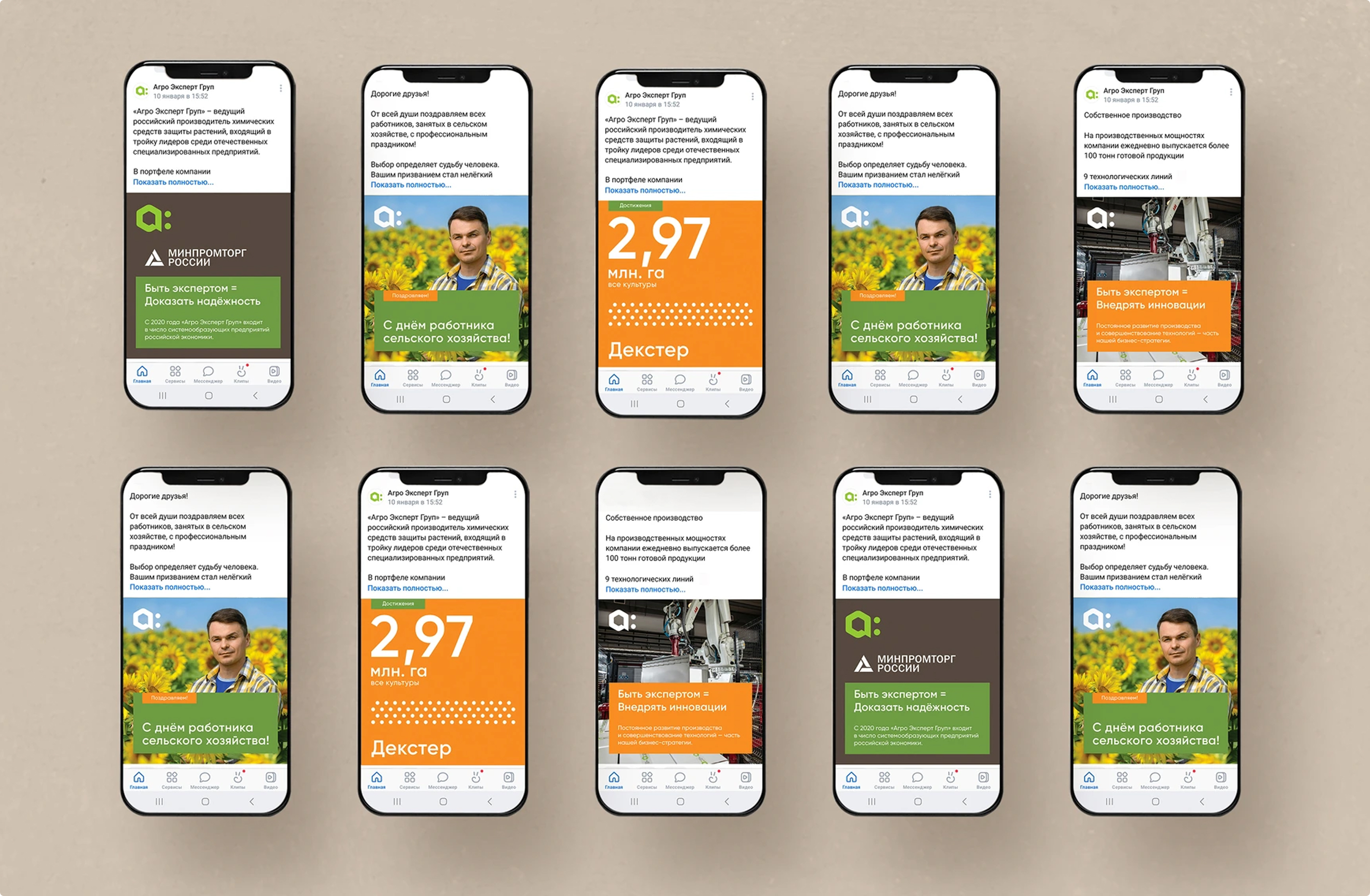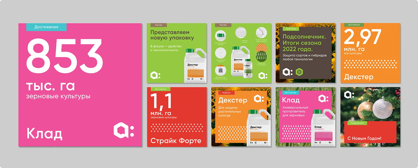 Помимо работы с потребителями на региональных мероприятиях («Дни поля», отраслевые выставки), большая часть коммуникации происходит в соцсетях ВК и телеграмм. Мы предложили тематический рубрикатор для постов в социальных сетях, который выполняет функцию навигации и заявляет актуальные темы: «достижения», «отзывы клиентов», «новинки», «приглашения на мероприятия» и т.д. Сделали систему дизайна постов и регламент по использованию фирменных цветов и графических элементов в дизайне карточкек.