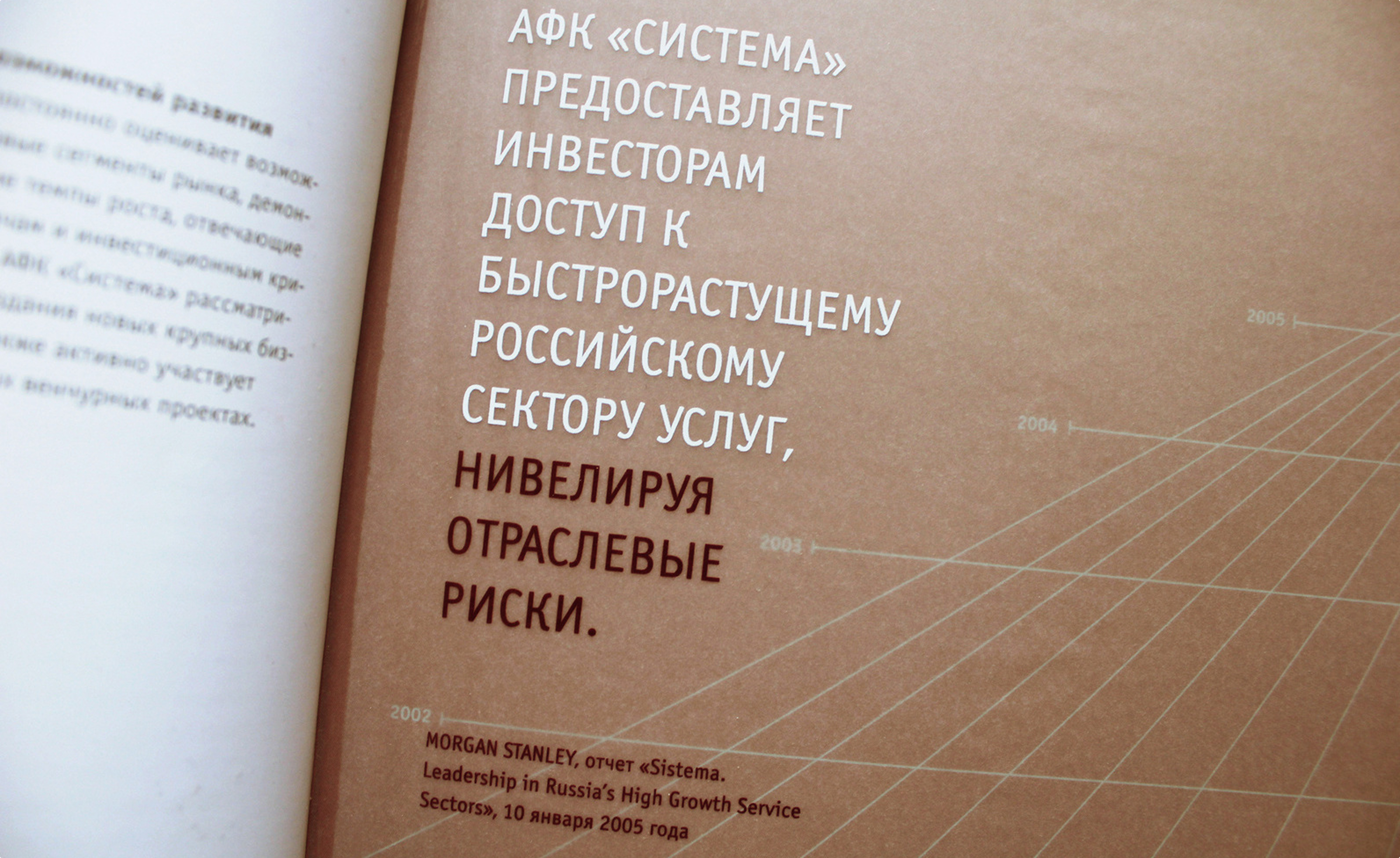 Так как это был первый отчет после выхода компании на IPO, важно было донести информацию коротко, ясно убедительно. Мы разработали подход, когда эксперты рынка говорят о бизнесе структурных подразделений «Системы», демонстрируя таким образом инвестиционную привлекательность группы. Слоган годового отчета: «Мы побеждаем — инвесторы выигрывают».