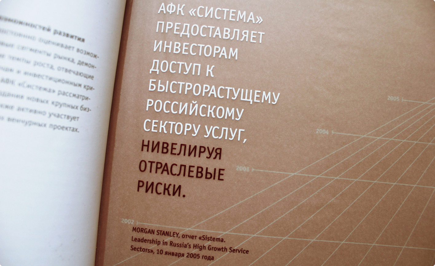 Создать креативную концепцию годового отчета одной из «голубых фишек» на российском рынке. Донести до инвесторов сообщение, что АФК «Система» и компании, входящие в холдинг, обладают высочайшей привлекательностью для российских и международных инвесторов.