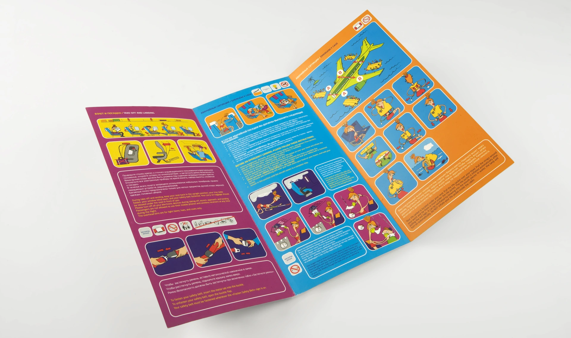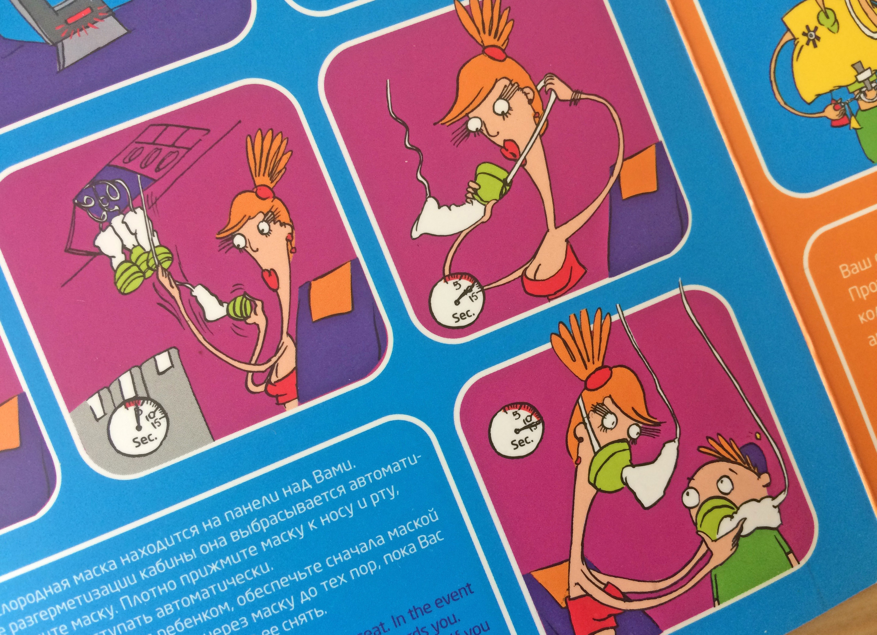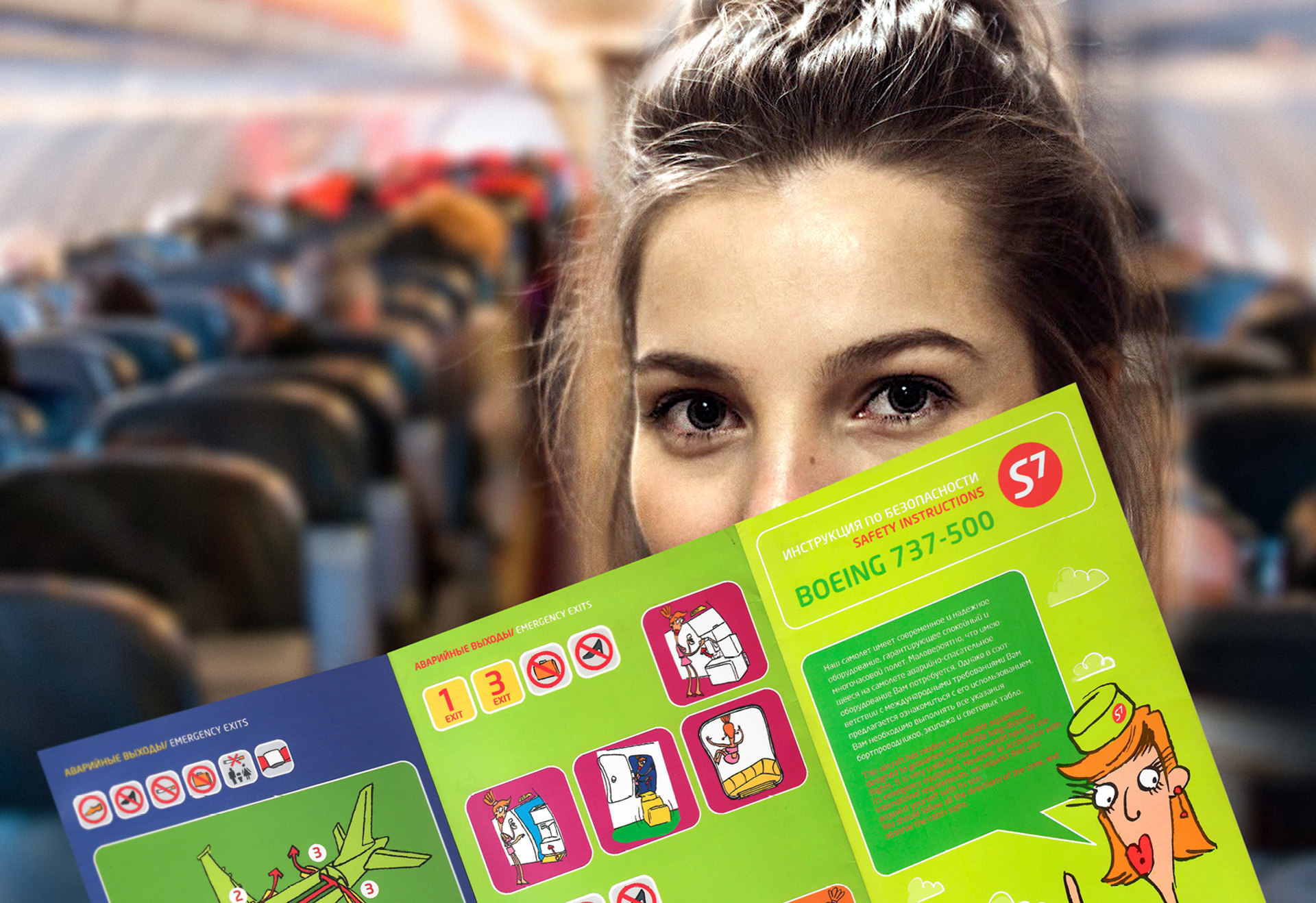 Инструкции по безопасности как правило не читают. Зачастую визуально материал оформлен так, что погружаться в него просто не хочется. Инсайт пассажиров – страх перелетов, боязнь соприкоснуться с информацией о нештатных ситуациях и авариях воздушных судов. Неформальный характер подачи информации в инструкциях S7 airlines, легкий и добрый юмор в иллюстрациях – все это позволяет преодолеть эти барьеры.