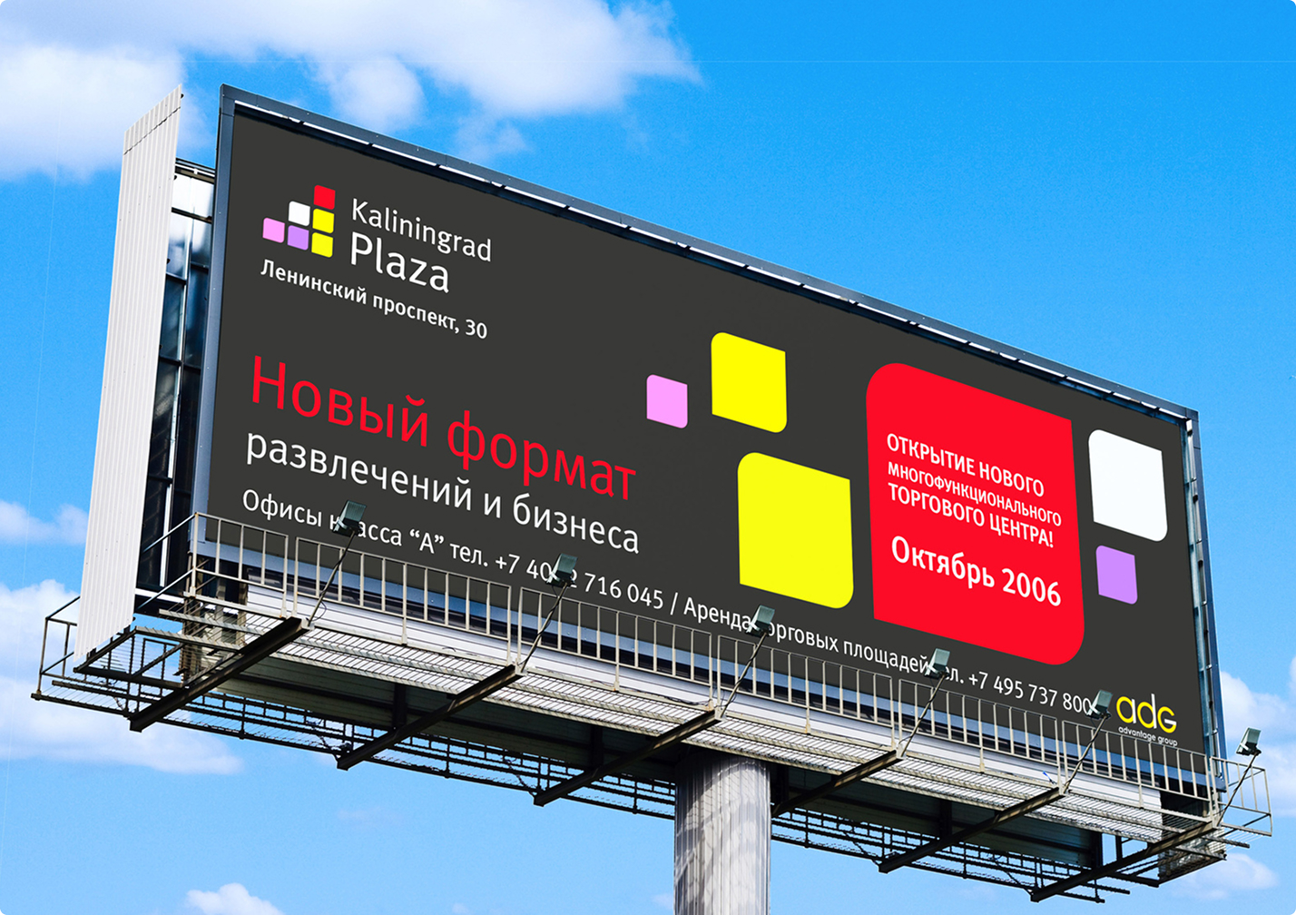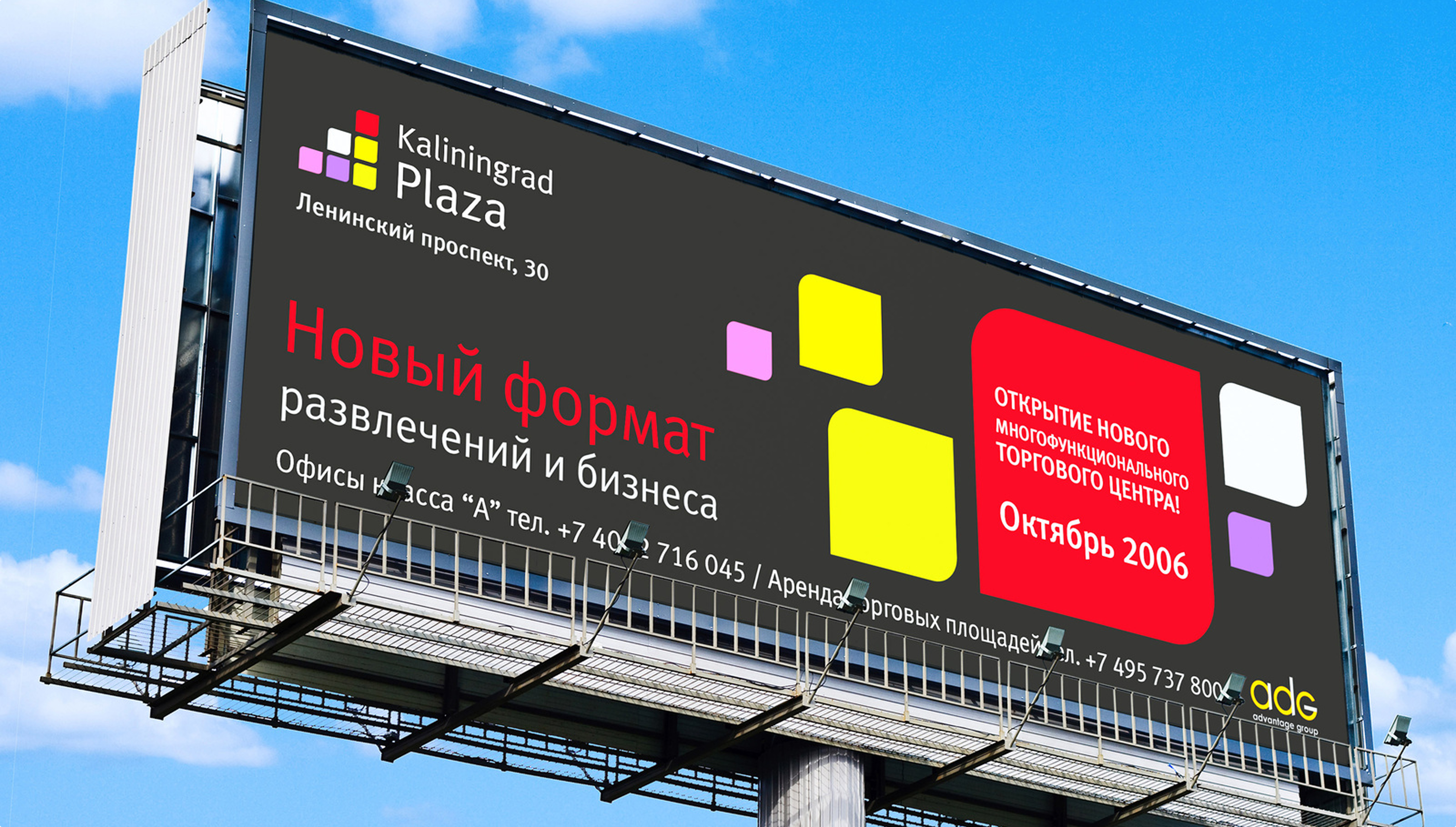 Разработать позиционирование и создать визуальный образ нового торгового центра по заказу ADG-Group. Разработать правила присутствия бренда торгового центра в интерьере и экстерьере, систему навигации, правила кобрендинга.