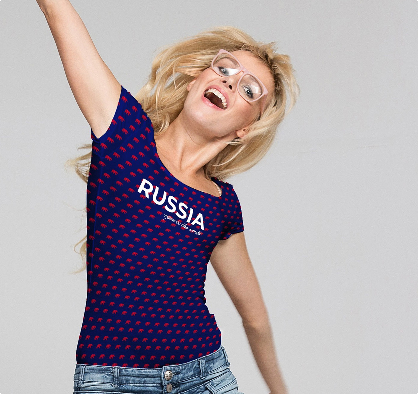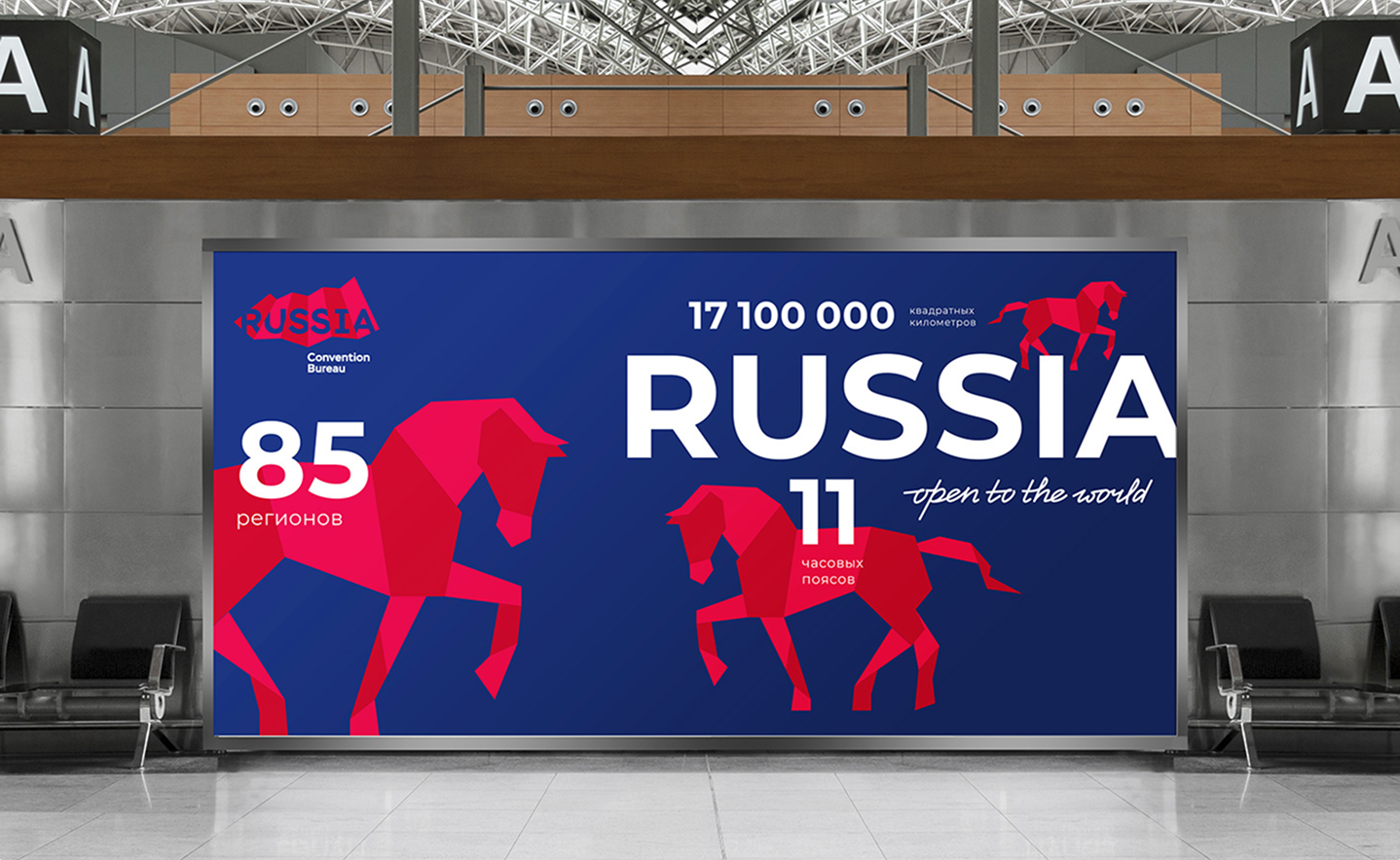 Оттолкнувшись от стилистики существующего логотипа, мы создали графические символы, которые транслируют образ неограниченных возможностей нашей страны. Визуальные образы подобраны с юмором, иронией и используют намеренно традиционные гештальты. При этом они позволяют передавать серьезные ключевые сообщения для целевых аудиторий. Этот подход отличается от традиционных коммуникаций государственных структур на международных площадках. Символы применяются в рекламных материалах по принципу контраста и масштаба изображений — тем самым передавая идею масштаба страны.