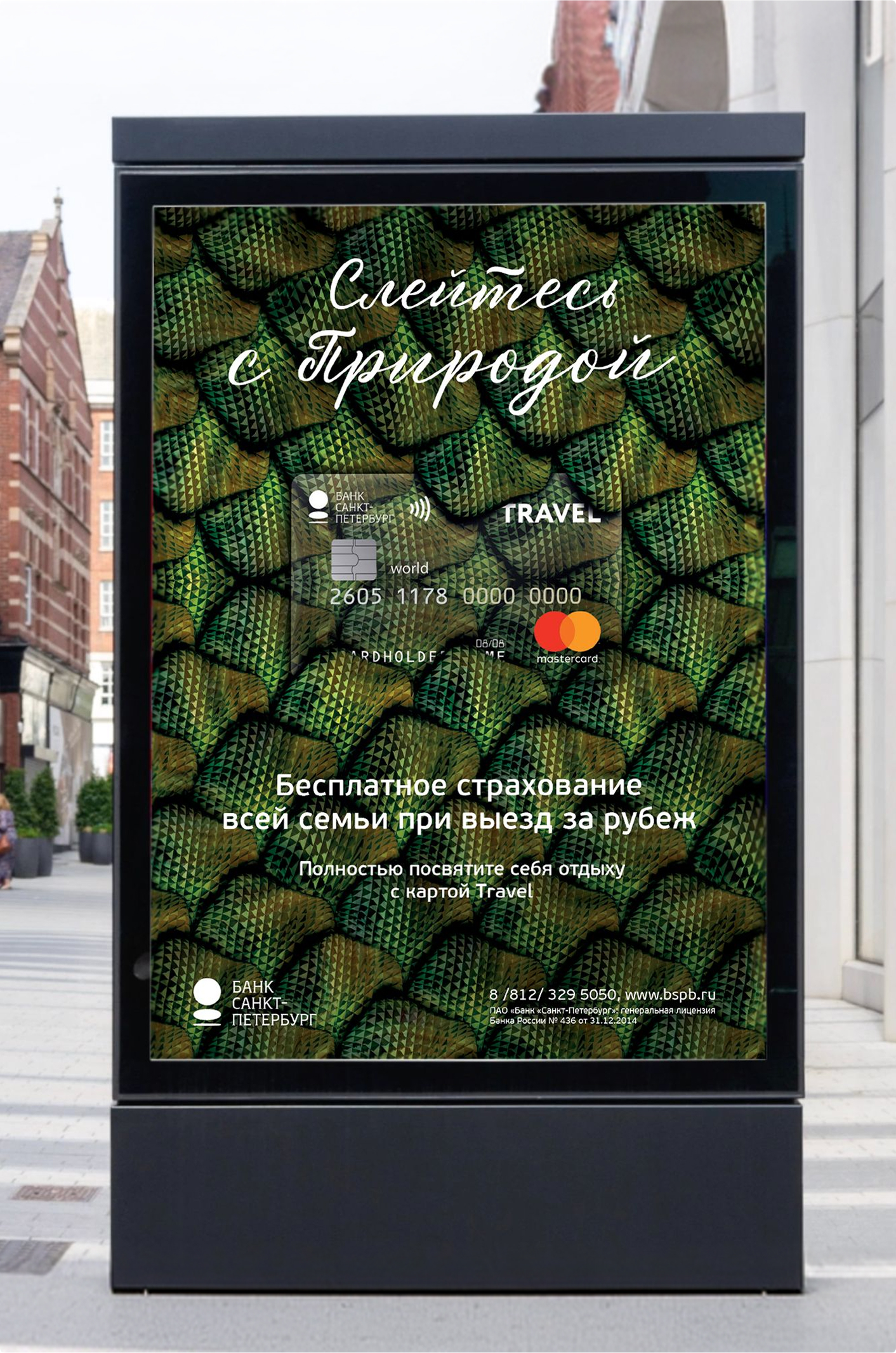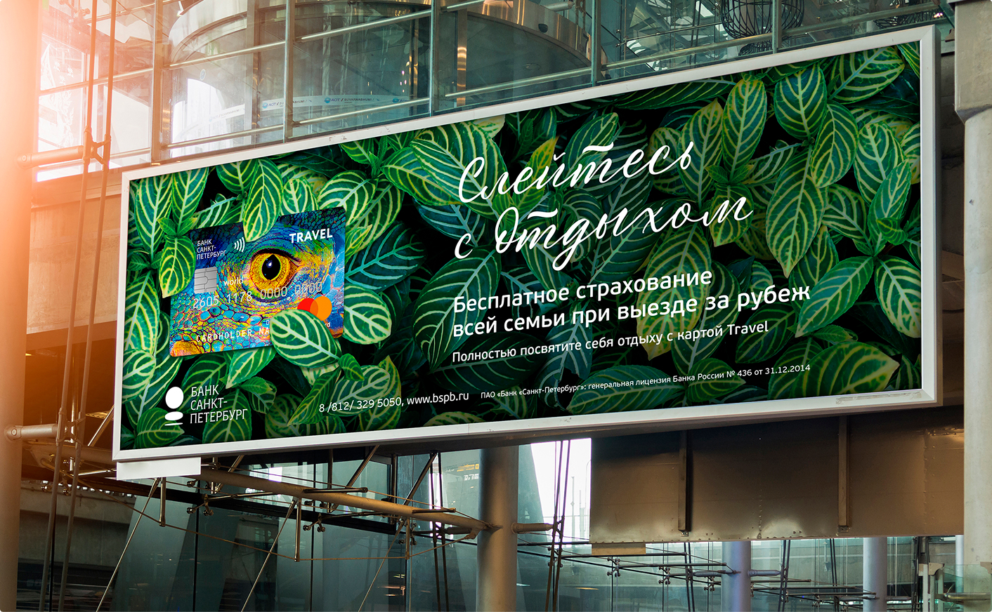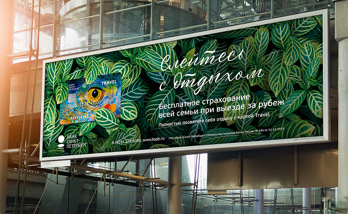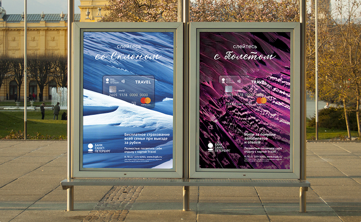 Поэтому карты Travel от Банка «Санкт-Петербург» дают возможность c головой окунуться в отдых. Слоган «Слейтесь с отдыхом» является открытой конструкцией, которая предполагает серию сообщений, представляющих мотивы путешественников и виды отдыха. В каждом сообщении мы представили какое-либо преимущество продукта, подкрепляющее рациональный выбор клиента-пользователя карты.