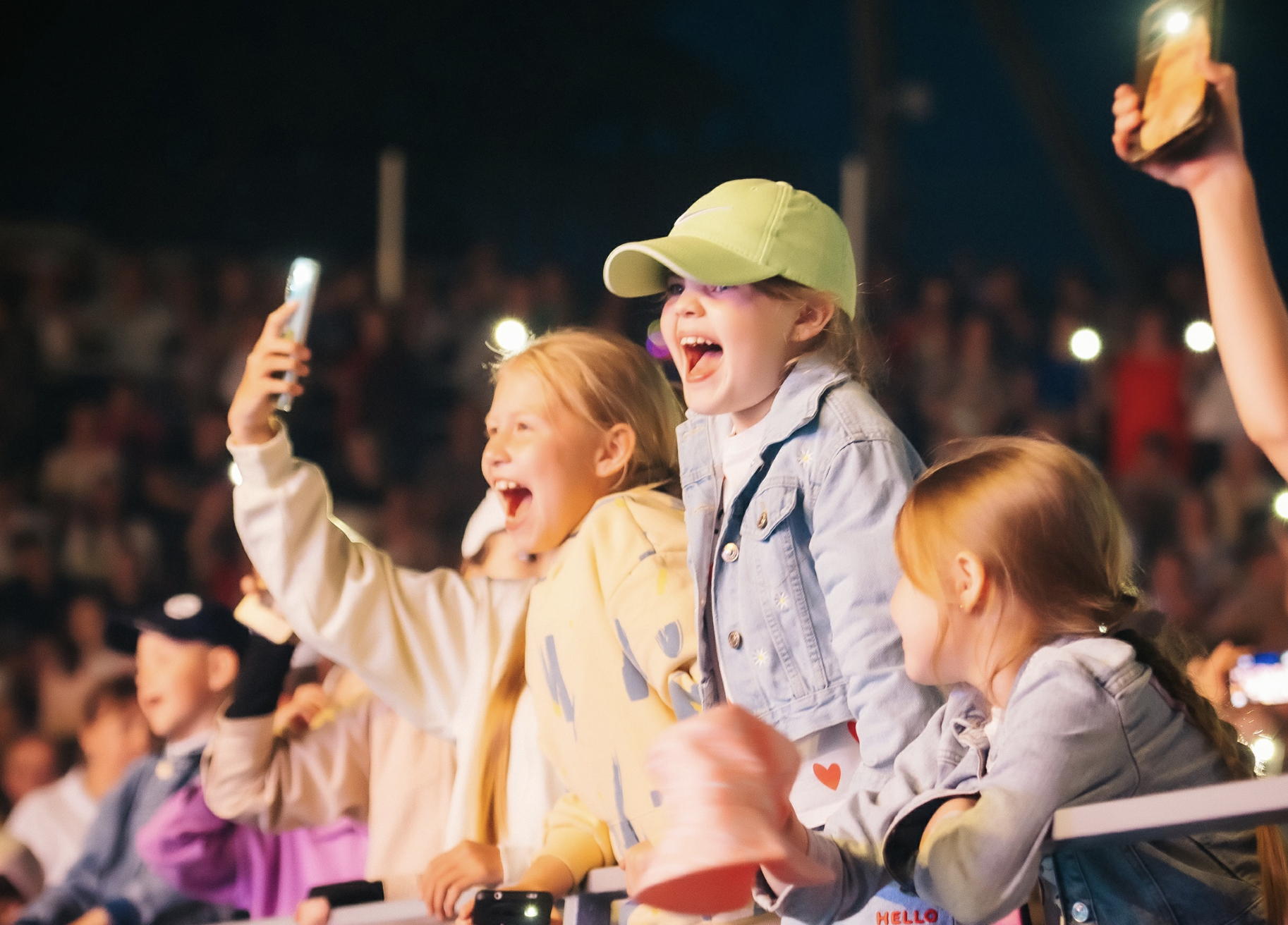 Мы оформили объекты социальной инфраструктуры (бассейн, фитнес-центр, стадион), входную группу городского парка и зоны активностей внутри него, внедрили элементы айдентики в экраны и в оформление сцены вечернего гала-концерта.