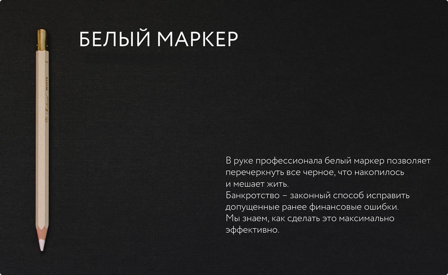 Мы разработали название компании — «Белый маркер», охраноспособное в необходимых для деятельности классах МКТУ. Название отражает позиционирование бренда и хорошо дифференцируется от конкурентов, которые в основной массе находятся в категорийном поле.